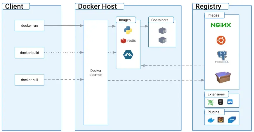 ์ฒ๋ฅผ ์ฌ์ฉํ๋ค. ๋์ปค ํด๋ผ์ด์ธํธ(docker)๋ ๋์ปค ๋ฐ๋ชฌ(daemon)๊ณผ ํต์ ํ๋ฉฐ, ๋์ปค ๋ฐ๋ชฌ์ ๋์ปค ์ปจํ