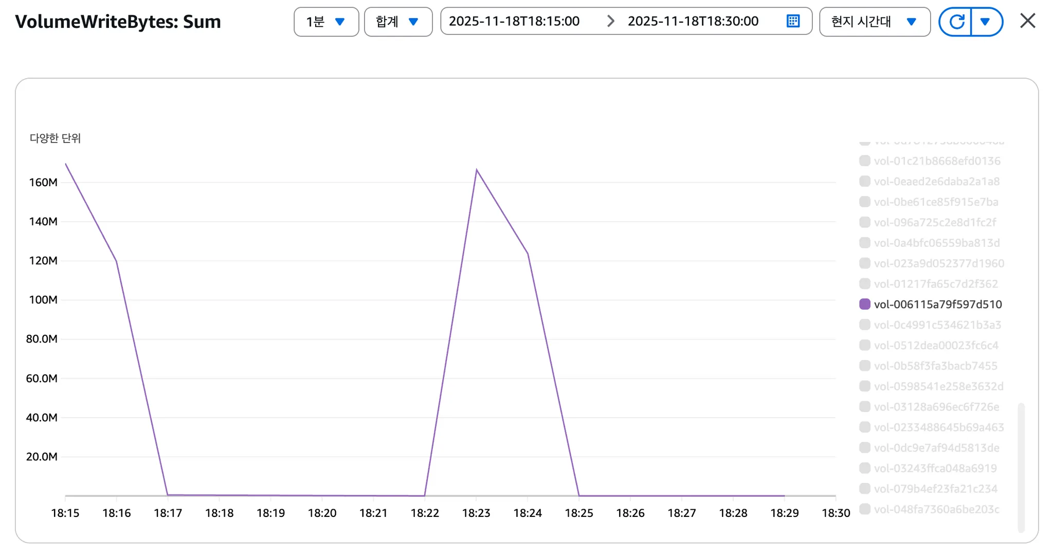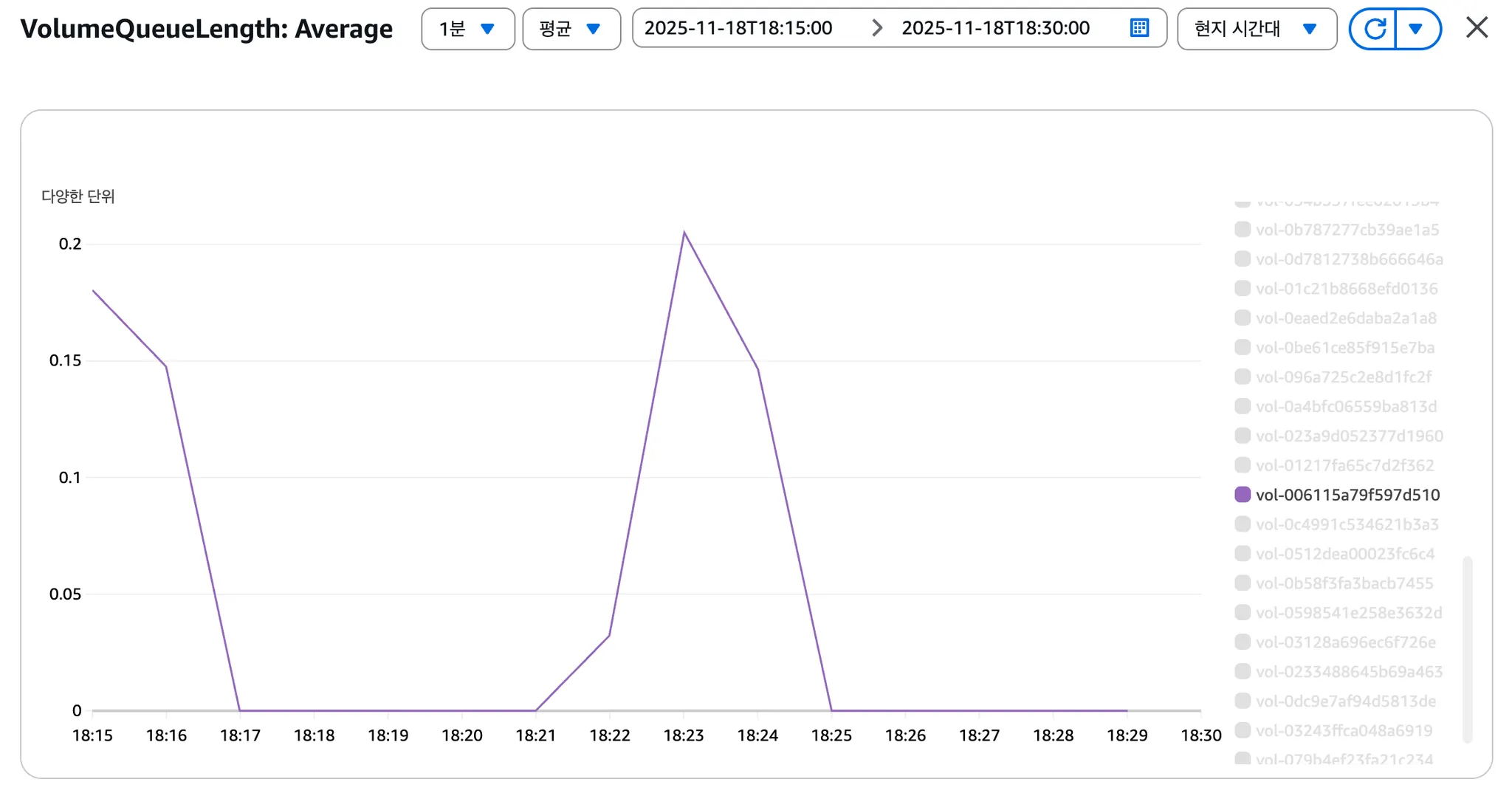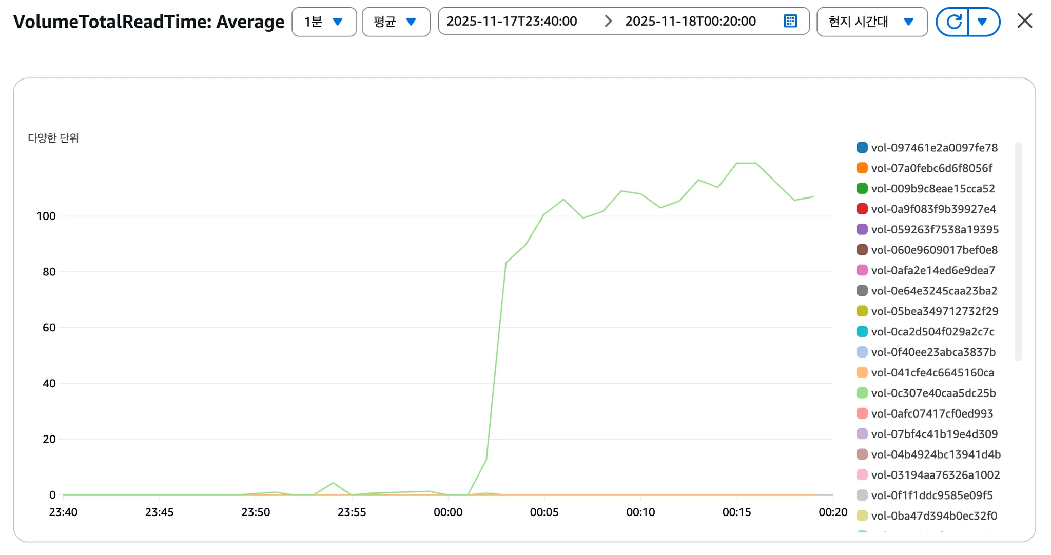 VolumeTotalReadTime/WriteTime μ΅λ 119μ΄, QueueLength κΈμ¦