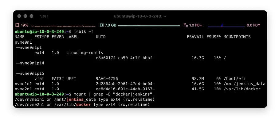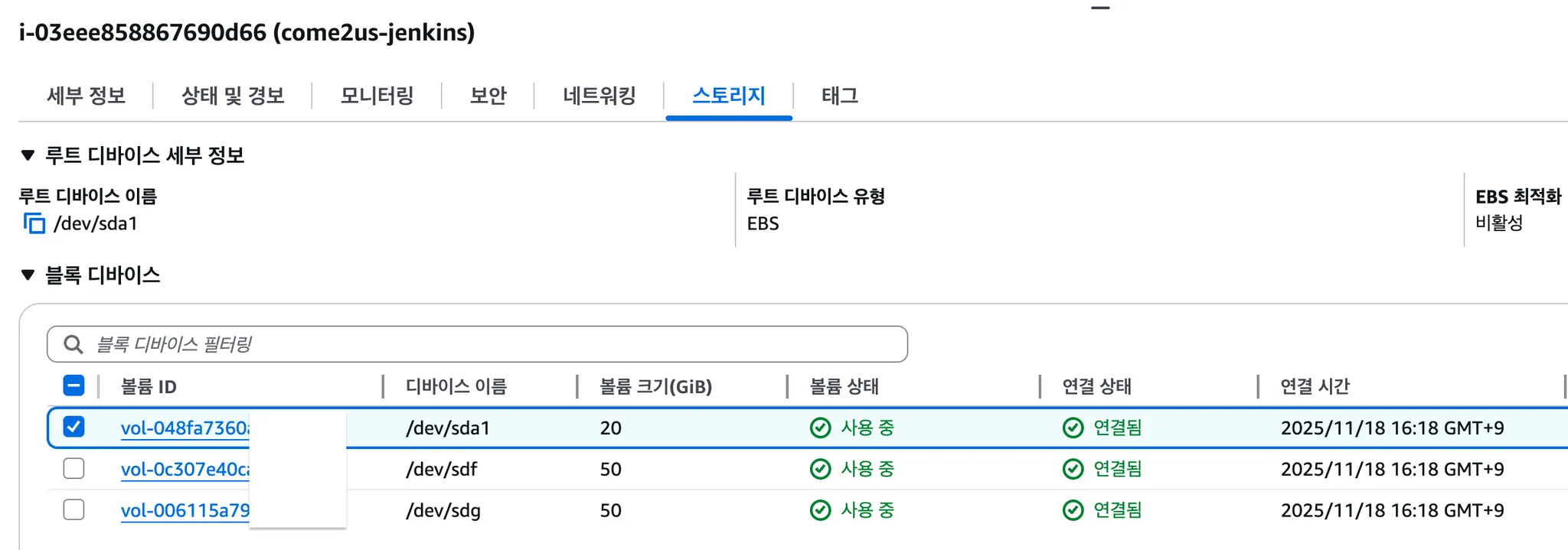 Userdataμμλ Jenkins Volumeλ λ§μ°¬κ°μ§λ‘ NVMe λ§€ν ν /mnt/jenkins_dataμ λ§μ΄νΈλ§ μννλ€.