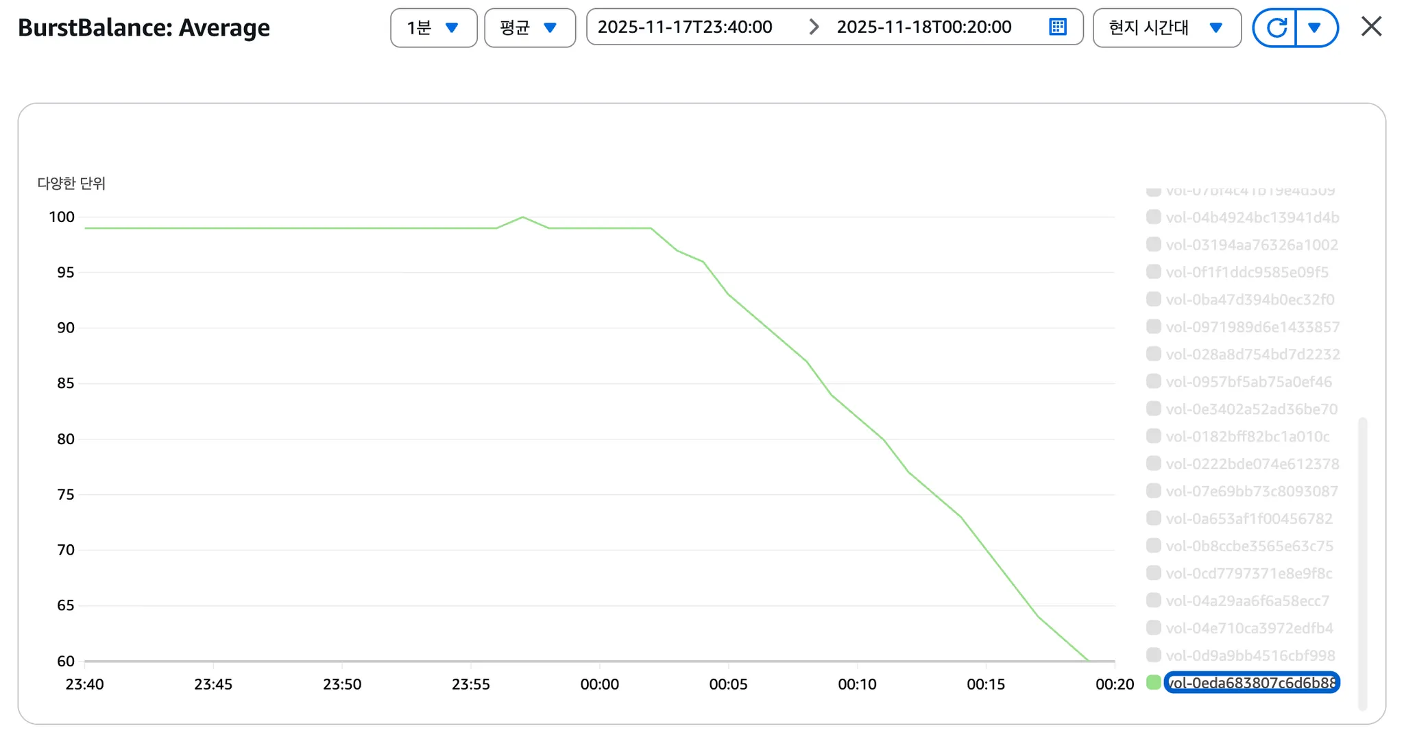 5) BurstBalance (gp2 ํฌ๋ ๋ง ๊ณ ๊ฐ) โ 2๋ฒ์งธ ํต์ฌ ์งํ