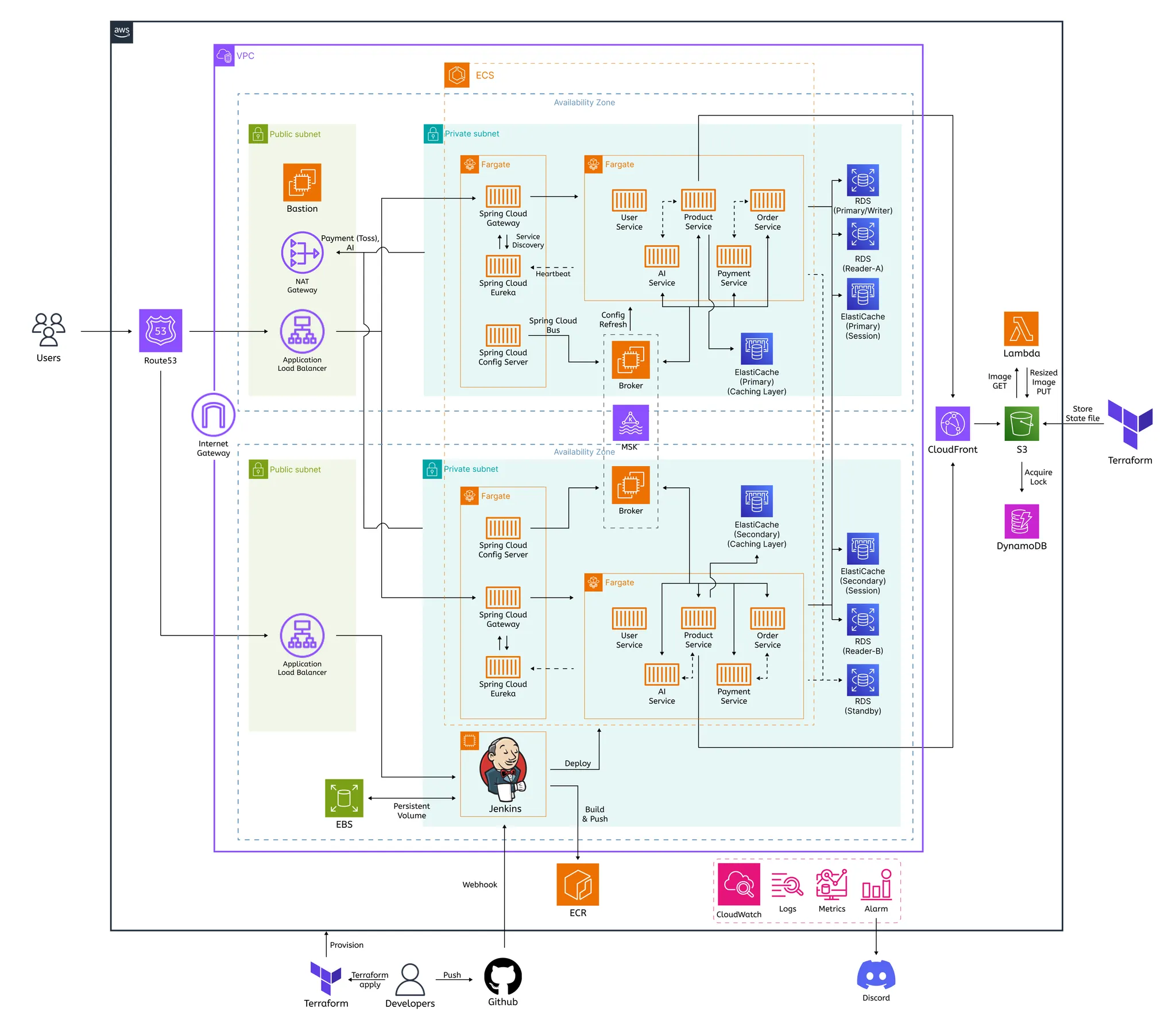Data Layer | RDS(PostgreSQL), ElastiCache(Redis Session/Cache), MSK(Kafka), S3 |